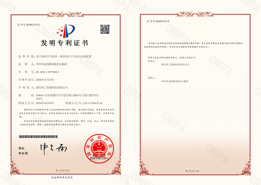 近日,國工智能新添國家知識產權局頒發的一項發明專利證書基于強化學習的單一體系的分子生成方法及裝置”。