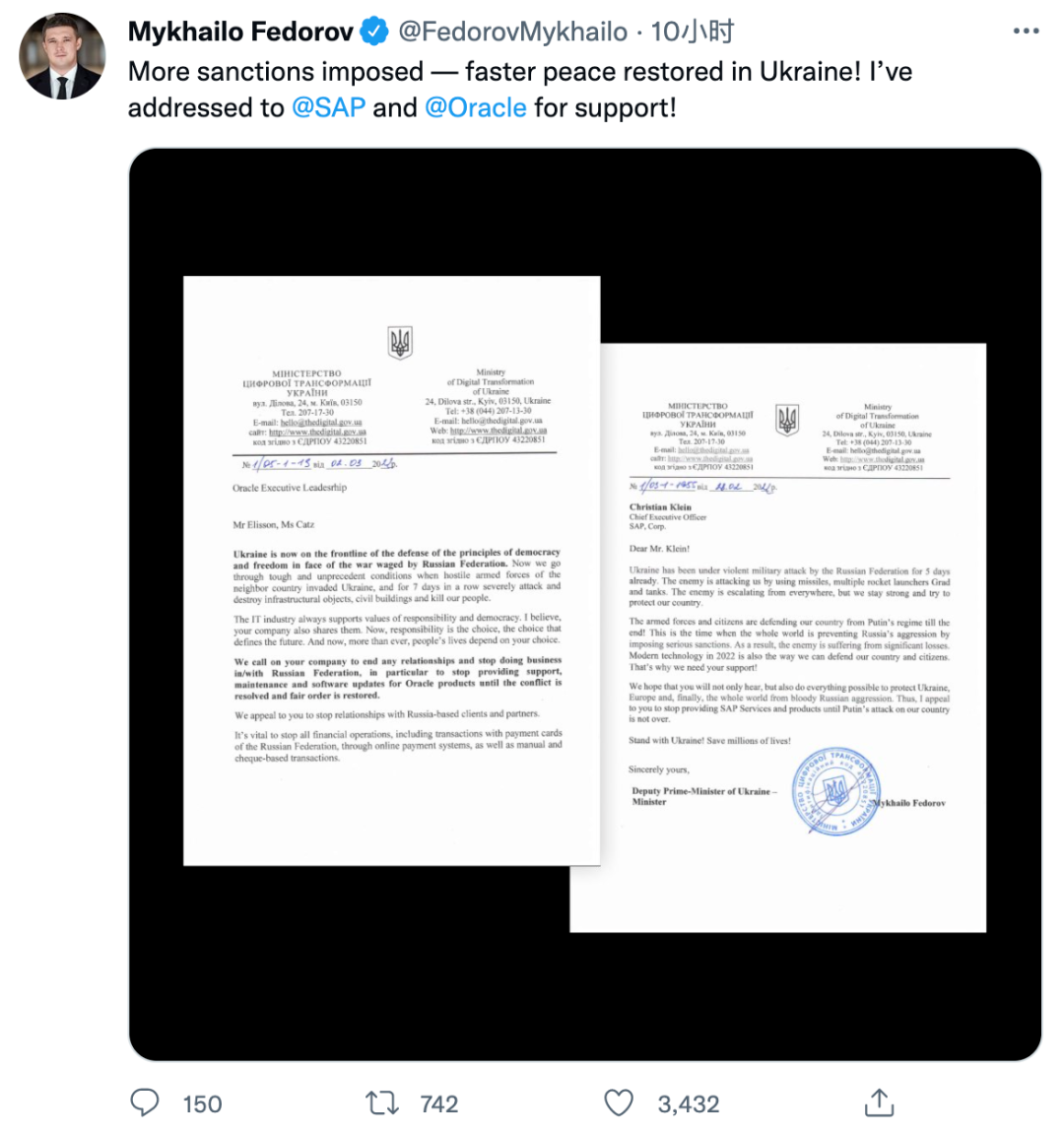 2022年3月2日,烏克蘭副總理兼數(shù)字化轉(zhuǎn)型部長Mykhailo Fedorov在推特上曬出了發(fā)給Oracle聯(lián)合創(chuàng)始人兼首席技術(shù)官Larry Ellison、Oracle首席執(zhí)行官Safra Catz和SAP首席執(zhí)行官Christian Klein的兩封信的副本。