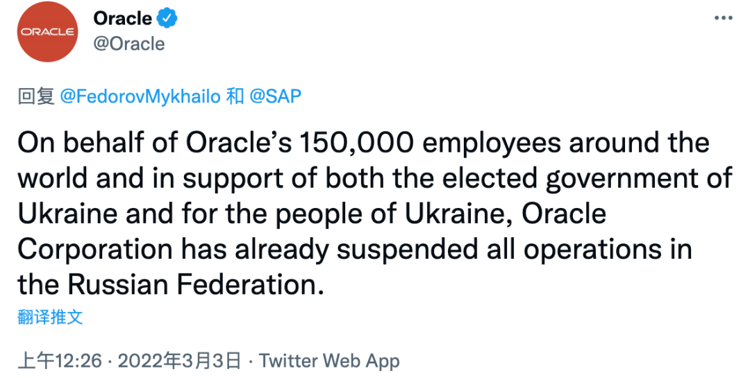 Oracle隨后發(fā)推文稱:“為了Oracle在全球各地的150000名員工的利益,為了支持烏克蘭民選政府和烏克蘭人民,Oracle公司已經(jīng)暫停了在俄羅斯聯(lián)邦的所有業(yè)務(wù)。”