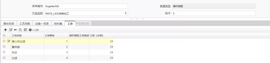 產品LB32自制加工的生產工序要求如下所示,需要4個工序,每個工序24小時,也就是1天。每個工序對應該工序的所需操作功用,按照工序順序依次分別為吊帶離心、不銹鋼結晶、搪玻璃反應、柱子過濾。
