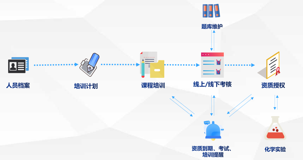 系統上線前,員工管理方式較為落后,儀器操作資質授權不及時,存在無資質人員操作儀器的風險。LIMS系統為所有員工建立電子檔案,檔案中記錄了培訓、考核、資質情況;管理者通過系統制定培訓計劃、組織培訓、員工考核,考核通過的員工賦予儀器操作資質授權,得到授權的員工可以操作指定的設備,提醒功能防止員工忘記培訓、考核及防止無資質人員操作儀器;徹底提升了人員管理水平。