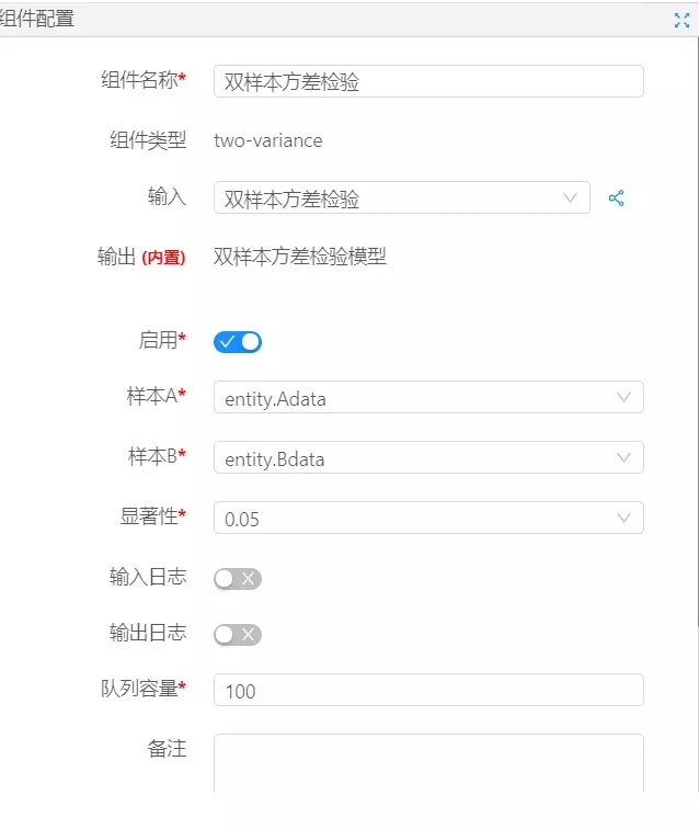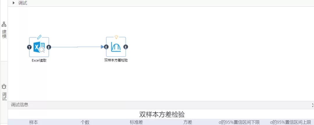 從數(shù)據(jù)大腦中的組件面板查找雙樣本方差檢驗(yàn)組件,拖到到工作面板,配置數(shù)據(jù),雙樣本方差檢驗(yàn)組件參數(shù),點(diǎn)擊運(yùn)行。
