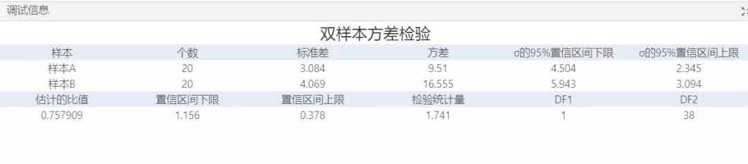 通過雙樣本方差檢驗(yàn)來判斷兩個組的方差或標(biāo)準(zhǔn)差是否不同,并計算可能包括兩個組的方差或標(biāo)準(zhǔn)差的總體比值的值范圍,通過對樣本的標(biāo)準(zhǔn)差和方差比的95%置信區(qū)間來判斷該組數(shù)據(jù)是否具有比較有效性,以及通過p值來判斷結(jié)果的可信程度從而推斷該假設(shè)是否可以成立。