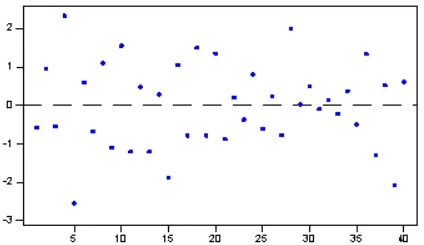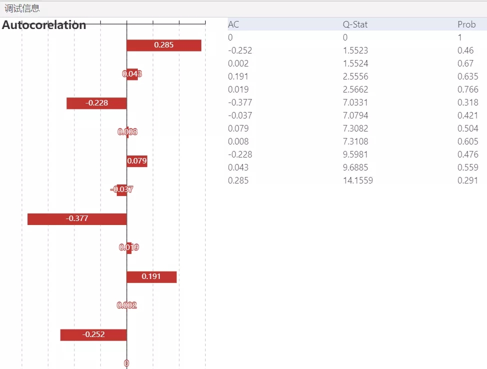 根據圖11可知,懷特檢驗統計量的值為1.052,它也服從自由度為2的卡方分布,在0.1的顯著性水平下,其臨界值=4.605,懷特檢驗統計量值<臨界值,接受原假設,該殘差序列存在方差相等的情況。