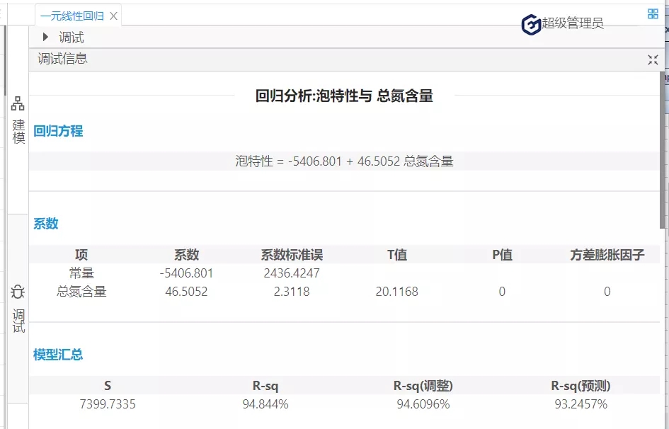 在下一批生產中,若X(總氮含量)=130,則Y(泡特性)的預測值=-5406.801+46.51*130=639.3(秒),以此類推,能夠預測到未來若干次生產中的成品啤酒的泡特性,可通過降低總氮含量等措施控制啤酒的泡特性,從而實現生產控制,實現效益最大化的目標。(具體預測及回歸模型含義國工數據大腦多元線性回歸在化學研發成本的預測一文)