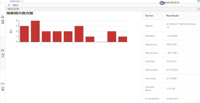 接下來,進行殘差檢驗的第二個方面:殘差序列正態性檢驗。(原假設:序列服從正態分布)在診斷方法下拉列表選擇:Histigram-Normality-Test;如圖3: