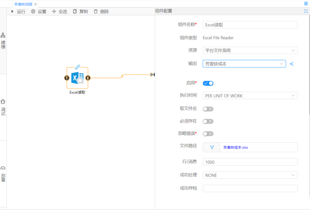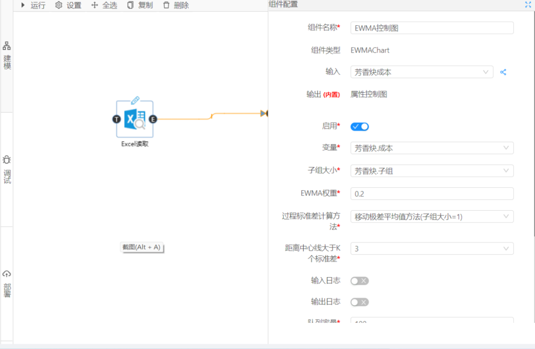 首先選取數(shù)據(jù)大腦的Excel讀取組件和EWMA控制圖組件,配置好相關(guān)資源,之后點(diǎn)擊左側(cè)的調(diào)試按鈕,如圖2,3所示: