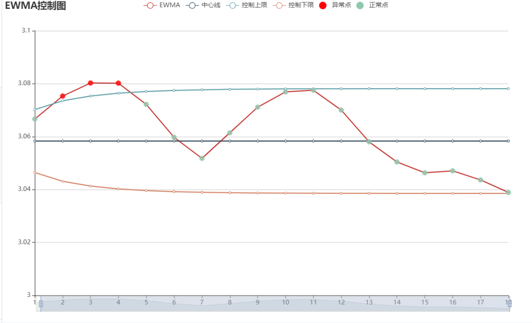 使用EWMA控制圖可以檢測(cè)過(guò)程均值的小偏移,因此該控制圖對(duì)個(gè)別高值或低值數(shù)據(jù)不敏感,比如生產(chǎn)過(guò)程中如果某個(gè)時(shí)間點(diǎn)的成本突然增高或者減少,則不會(huì)在控制圖中體現(xiàn)出來(lái),因此如果想檢測(cè)單個(gè)數(shù)據(jù)的穩(wěn)定情況,可以使用Xbar_R控制圖或者I_MR控制圖。