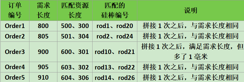 最近公司在與客戶交流業務的過程中了解到這樣一個需求,生產車間要生產指定材質、規格(截面存在正方形和圓形兩種,邊長和直徑也會不同)、長度的硅棒,倉庫中存儲著各種格式材質、規格、長度的硅棒,需要按照需求到倉庫中去取對應的原料,有符合條件的直接滿足需求,若材質和規格相同,但是長度不同的話就需要將多個較短的硅棒進行拼接以滿足需求。倘若每次只有一個需求,按照現有庫存的原料情況,人還是比較容易去獲取相應的原料去拼接滿足需求。如果每次有一批這樣的需求,不但要滿足在材質、規格、長度上的要求,而且在拼接次數上,拼接后超出長度的限制上有要求,人員就很難通過簡單的觀察比較去處理了。