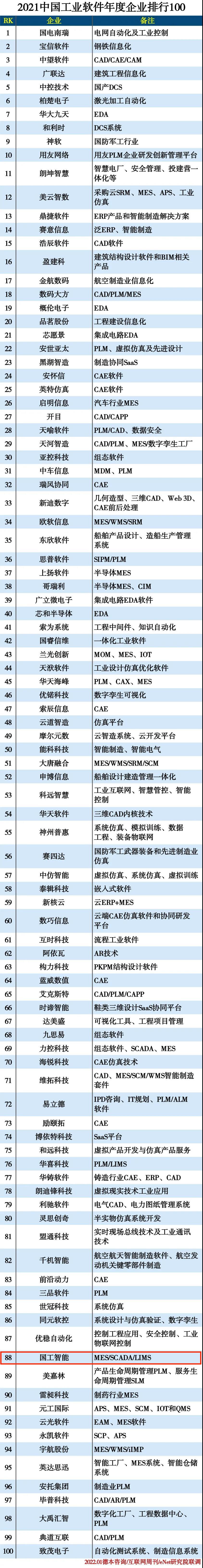 1月10日,《互聯(lián)網周刊》聯(lián)合eNET研究院、德本咨詢發(fā)布了“2021中國工業(yè)軟件年度企業(yè)排行100”排行,國工智能位列第88名!