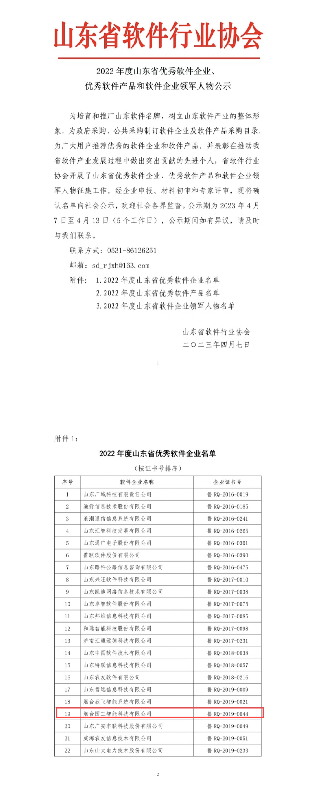 日前,山東省軟件行業(yè)協(xié)會發(fā)布《2022年度山東省優(yōu)秀軟件企業(yè)、優(yōu)秀軟件產(chǎn)品和軟件企業(yè)領(lǐng)軍人物公示》,煙臺國工智能科技有限公司被授予“山東省優(yōu)秀軟件企業(yè)”。